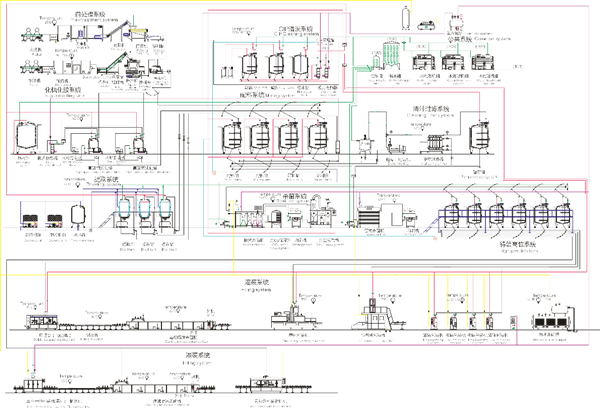 生產線示意圖包含生產線的各個生產環節,清晰標注在圖紙上,更直觀看出各個生產線環節及生產所需的設備。生產線示意圖包含了前期處理設備,cip清洗系統、公共系統、提取系統、過濾系統、殺菌系統、灌裝系統、后道包裝系統,整條生產線更加人性化設計,設備全部自動化,減少了人工投入,同時更好的增加了產品生產效益。