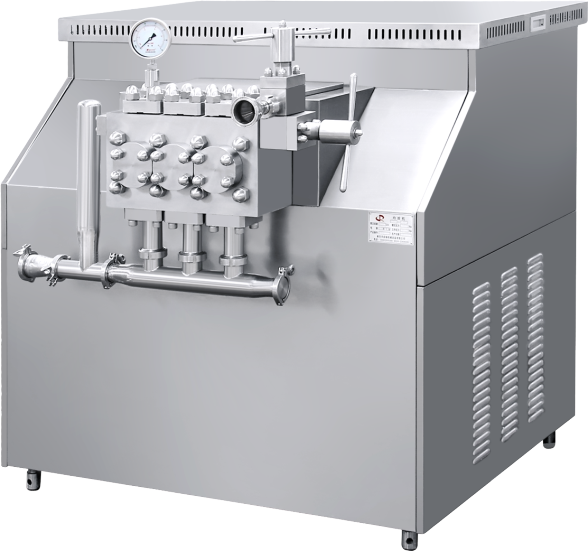 生產(chǎn)型均質(zhì)機主要工作是通過柱塞往復運動將被加工物料以高壓的形式送至均質(zhì)閥,使物料流經(jīng)閥頭與閥座間微小的隙瞬受到湍流、空穴、撞擊、剪切等復合的作用,將原先粗糙的乳濁液或懸浮液加工成極細微的、均勻穩(wěn)定的液與液相混乳化物或液與固分散物。